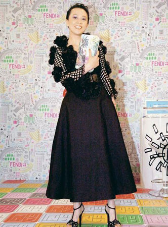 劉嘉玲開心展示她重拾畫筆為Fendi設(shè)計(jì)的手袋。香港明報(bào)圖。