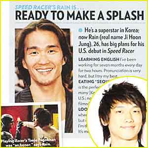 美國演員卡爾·楊最近是春風(fēng)得意,剛剛主演了沃卓斯基導(dǎo)演的《極速賽車手》不說,還“錯誤地”登上了美國著名的《人物》雜志!度宋铩冯s志的編輯把卡爾·楊誤認(rèn)為是韓國明星Rain,在照片邊上還配了一段文字:“他在韓國是鼎鼎大名的超級巨星,本名叫鄭智熏,粉絲們都稱他‘Rain’,《極速賽車手》是他投身好萊塢的第一步! 微特