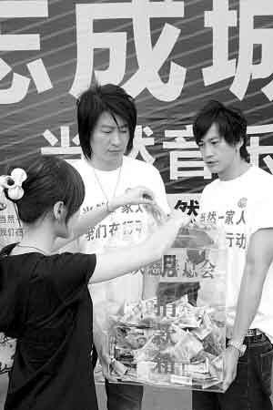 昨天,游鴻明、何潤(rùn)東、陳怡蓉、沈建宏、鄧寧、劉錫明、阿清、高磊、晨辰等當(dāng)然音樂(lè)的歌手抵達(dá)重慶。他們帶著70余萬(wàn)元的救災(zāi)物資和9顆愛(ài)國(guó)之心在重慶街頭為汶川地震的災(zāi)后重建募款。在重慶石橋鋪佰騰數(shù)碼廣場(chǎng)、沙坪壩步行街、江北北城天街三個(gè)募捐點(diǎn),累計(jì)3小時(shí)的募款活動(dòng)中,何潤(rùn)東等9位藝人共籌集善款187400余元,目前這個(gè)數(shù)字還在不斷增加。