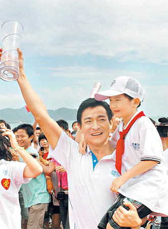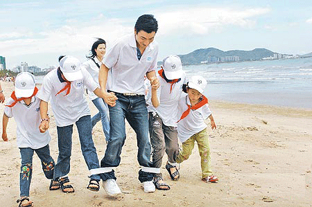 中新網6月6日電 據臺灣媒體報道,劉德華(華仔)日前帶著80名災區(qū)小朋友,參加在海南島三亞灣舉辦的“汶水入!彼拇ㄙc災活動。華仔與小朋友玩起5人6腳在500米長的沙灘上進行接力傳遞,華仔最后還抱起1名災區(qū)小朋友,將象征愛心與祝福的汶川之水舉起倒入大海,完成儀式。