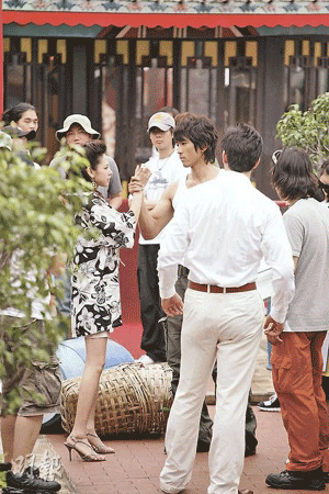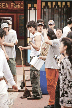 據(jù)香港《明報》報道,由于韓劇《伊甸之東》劇組要保持劇集內(nèi)容的神秘,故記者采訪時要保持遠距離。不過現(xiàn)場得見,宋承憲的“掃地”裝扮也有型過人,白色背心與軍褲,展示健碩身形。而跟他有對手戲的Zoie也被其電眼電暈,不敢與他對望。