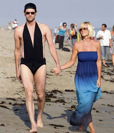 中新網7月7日電 好萊塢喜劇明星金·凱瑞趁美國獨立紀念日假期,和女友珍妮·麥卡錫一起在馬里布海灘散步,沒想到他身上穿的竟然是女友之前才剛穿的泳裝,十分搞笑。