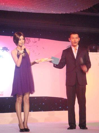 當(dāng)晚,女星范冰冰著一身紫色露背晚裝壓軸登場。范冰冰稱自己此次設(shè)計的冰淇淋月餅是特意為奧運健兒劉翔所做。她說,劉翔的名字里有個“翔”,所以在這個冰淇淋月餅原有的基礎(chǔ)上加了一對翅膀,希望這個跑得最快的天使,在今年北京奧運會上能再次奪冠,也祝福所有正在為奧運正在忙碌的人們。