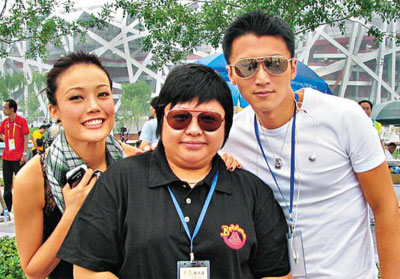 容祖兒、謝霆鋒、韓紅在鳥巢外合影留念。