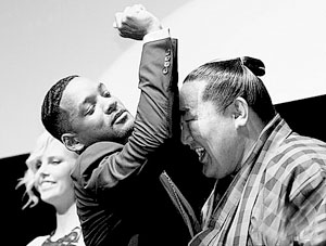 黑人巨星威爾·史密斯在《全民超人漢考克》中無所不能,不過到了現(xiàn)實生活中可沒那么威風(fēng),不但不能舉起汽車,甚至連日本相撲手的腕子都掰不動。