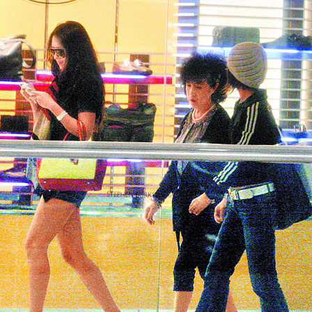 章子怡(左起)日前帶媽媽、助理到香港血拼,一路上不停察看手機短信。