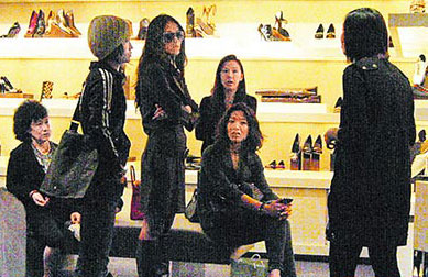 章子怡(左三)試鞋,不停詢問旁人的意見。