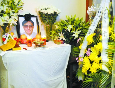 絡(luò)繹不絕的親友和媒體記者趕往了謝晉家中,花籃、悼信、慰問品已在前廳和書房堆積。一束菊花、一束白色百合、一對香燭、一盆水果,下午搭起的靈堂簡單肅穆。記者昨天傍晚來到謝晉家中,只見設(shè)于書房的靈堂前已供起了一幅遺像,遺像的照片選自2006年謝晉為赴美辦護照而拍攝的護照照片。