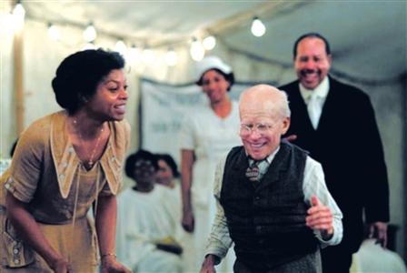 《本杰明·巴頓奇事》是一部劇情怪誕的影片。影片的男主人公是個叫本杰明·巴頓的怪人(布拉德·皮特飾),他一生下來就是個滿頭華發(fā)、一臉褶子的古稀老頭(劇照中皮特的體型很小,估計(jì)是個“老嬰兒”)。可奇怪的是,他的生物鐘是倒著走的——別人越活越老,他卻越活越小。巴頓1919年出生,不經(jīng)意間愛上了一個名叫黛西的6歲女孩,30年后,兩人終于“長”得年齡相仿了。他們彼此相愛,度過了人生中最美好的一段時光。皮特在化裝和特效的幫忙下,變成了一個貌似被風(fēng)干的小老頭,形象十分驚人,與壯碩的皮特判若兩人。 欣聞