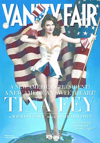 《名利場》雜志2009年1月號封面,邀在大選期間因模仿共和黨候選人莎拉·佩林而走紅的蒂娜·菲當封面女郎。照片中,菲穿著美國國旗色的性感低胸超短裙,手執(zhí)美國國旗,神采飛揚,雜志封面的大標題是“新美國總統(tǒng),新美國甜心”。蒂娜·菲還在該雜志的專訪中透露自己是扁平足患者。