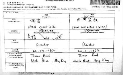 倪震發(fā)表結婚聲明后,19日,香港記者在金鐘婚姻登記處發(fā)現倪震和周慧敏簽下的擬結婚通知書。登記處職員表示,簽下通知書后男女雙方最快17天以后正式成為夫婦。