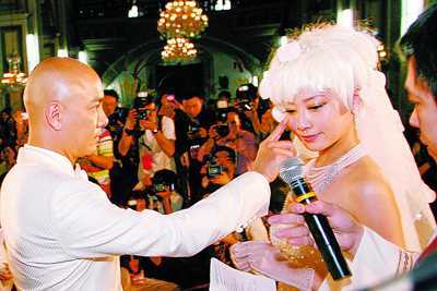 兩點四十左右,婚禮正式開始。在牧師的主持下,張衛(wèi)健和張茜交換了戒指,并分別向?qū)Ψ叫膶⒁簧皇缾壑鴮Ψ剑斑@個戒指代表了我對你的愛和忠貞!贝藭r,一直在教堂觀禮的雙方親朋好友爆發(fā)出了歡呼聲和掌聲,而兩位新人也是激動非常,張茜更是激動得流下了幸福的淚水。在親朋好友和媒體的見證下,張衛(wèi)健對張茜深情一吻,并雙雙簽署結(jié)婚證書。