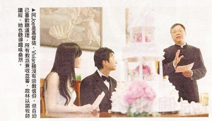 5日下午,一眾出席倪周婚禮的賓客在四時(shí)前到場(chǎng),獲邀擔(dān)任證婚人的是好友Kenny與丈夫吳先生。婚姻監(jiān)理人由陳姓律師擔(dān)任,儀式簡(jiǎn)單卻神圣。一對(duì)新人宣讀誓詞,然后交換結(jié)婚戒指,簽上名字,再將別致的羽毛筆交到婚姻監(jiān)理人與證婚人手上,簽名后林以諾牧師現(xiàn)身,宣讀哥林多前書十三章至八節(jié)——愛是恒久忍耐,又有恩慈,愛是不嫉妒,愛是不自夸,不張狂……以祝福一對(duì)有情人,壓軸節(jié)目是新人切結(jié)婚蛋糕,與眾同樂,一起分享甜蜜滋味。