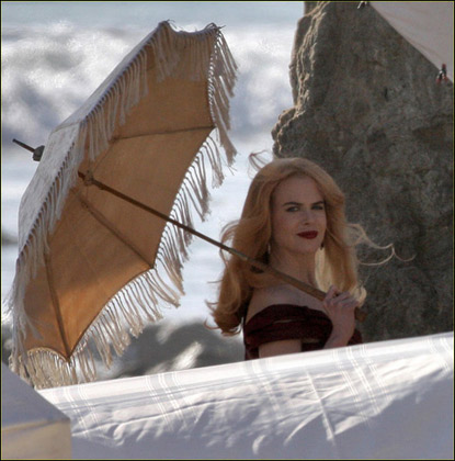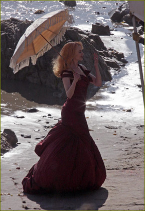 妮可·基德曼2月19日在洛杉磯的某海灘上為某雜志拍攝宣傳寫真,當天的妮可·基德曼化身中世紀的貴婦,穿著暗紅色的絕美長裙,襯得身材玲瓏,肌膚透白,手中的陽傘更是增添了高貴優(yōu)雅,和妮可·基德曼得天獨厚的氣質(zhì)完全符合。
