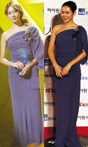 上周五(2月27日)韓國百想頒獎典禮,孫藝珍穿長款紫色禮服出場;而在隔天(28日)的2009上海新娛樂慈善群星會上,林志玲竟穿一模一樣的禮服登場。撞衫常見,而撞得時間如此緊密,實在有趣。