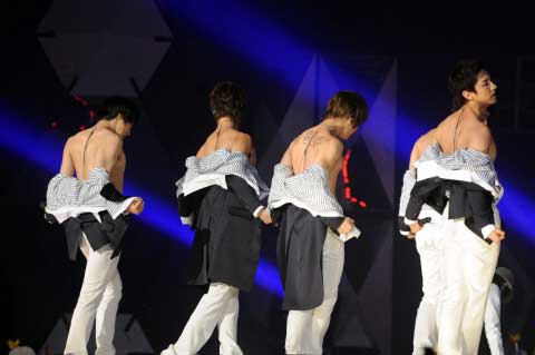 29日下午,“2008 SBS歌謠大典”在京畿道一山國(guó)際展覽中心(KINTEX)進(jìn)行了現(xiàn)場(chǎng)直播。節(jié)目當(dāng)天,東方神起在上臺(tái)演唱熱門(mén)歌曲《咒文》(MIROTIC)時(shí),在結(jié)尾處齊齊脫去上衣亮出了有型背肌,引得現(xiàn)場(chǎng)粉絲尖叫連連。