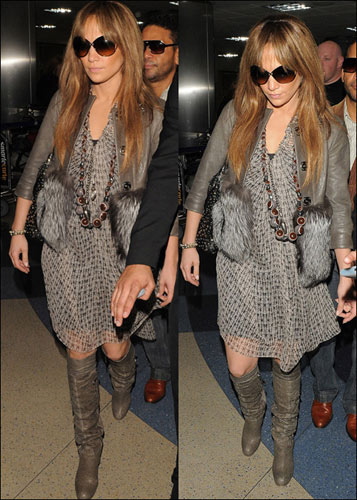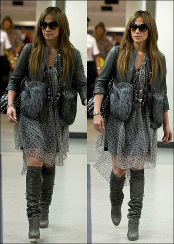 詹妮弗·洛佩茲實在是太漂亮了!結(jié)束了自己的日本宣傳活動,匆匆回國的詹妮弗·洛佩茲在機(jī)場大大的高貴了一把,灰白黑色的雪紡紗連身長裙浪漫飄逸,外面為了保暖配了皮質(zhì)外套,但是袖口處的毛毛設(shè)計極致奢華高貴,大釘子書包混搭效果明顯,大配飾項鏈真是好看~~小編覺得喜歡這樣浪漫奢華的MM們一定要學(xué)習(xí)學(xué)習(xí),保證是回頭率300%。
