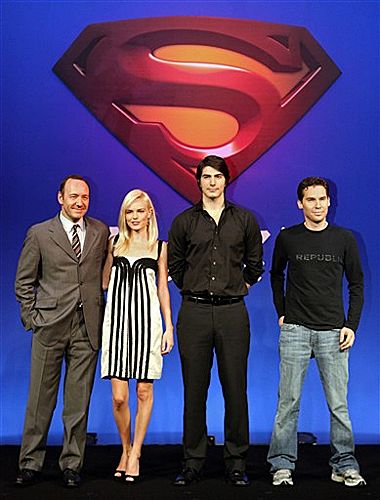 8月1日,電影“超人歸來”在日本東京做宣傳。圖為劇中演員凱文·斯帕西(左一)、 凱特·伯斯沃斯(左二)、布蘭登·羅斯(右二),以及導(dǎo)演布萊恩·辛格(右一)。(法新社圖)