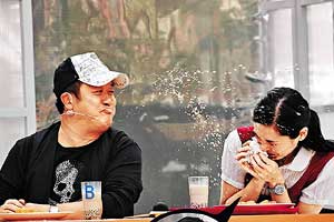 中新網(wǎng)10月22日電 據(jù)《新明日報》報道,香港無線電視最近在臺灣為《味分高下》終極篇錄影,昨日在臺北小巨蛋門前拍攝。《獎門人》主持人曾志偉絲毫不懂憐香惜玉,喝珍珠奶茶時,居然將牛奶茶噴得郭羨妮滿頭都是。郭羨只能強顏歡笑,十分狼狽。
