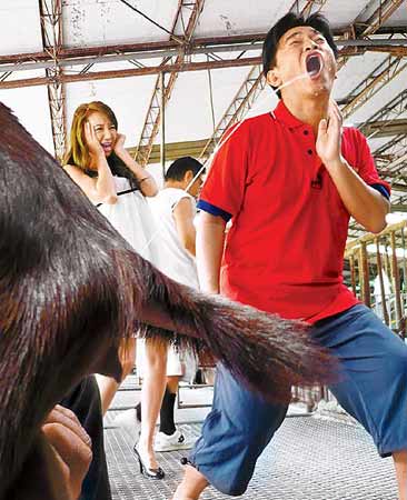 中新網(wǎng)10月25日電 臺(tái)灣媒體報(bào)道,吳宗憲(右)跟女星Linda日前在臺(tái)灣南部牧場(chǎng)錄臺(tái)視《綜藝大勝戰(zhàn)》,被制作單位要求現(xiàn)場(chǎng)喝羊乳,看到熱騰騰的羊乳直接“射”過(guò)來(lái),Linda嚇到花容失色,反而是吳宗憲自得其樂,不僅歪嘴接奶,還喝到溢奶。