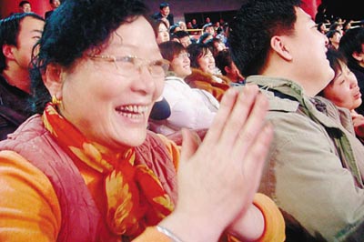 “‘裝’你們知道不?‘裝’在我們東北就是‘顯擺’的意思。你說我老師(指魏積安扮演的田教授)他多能裝呀!花5000塊錢買雙皮鞋,6000塊錢買塊手表,7000塊錢鑲口大金牙,然后一見我面就這樣:你看現(xiàn)在都8點(diǎn)了,我一會(huì)請(qǐng)你吃飯,你要不去我踢你……”這一段新加的臺(tái)詞配合著小沈陽夸張的齜牙咧嘴的動(dòng)作,把現(xiàn)場(chǎng)的觀眾都笑翻了。坐在記者身邊一位40多歲的大姐一連笑一邊捂肚子,記者問她是東北人嗎?能聽懂小沈陽的笑料嗎?大姐還滿臉的納悶:“這還用分哪兒地方的人嗎?誰聽誰不樂呀!”從昨日的現(xiàn)場(chǎng)來看,為了突出小沈陽的個(gè)人魅力,有長(zhǎng)達(dá)一分半鐘的時(shí)間都是小沈陽一個(gè)人在舞臺(tái)上脫口秀,而這段臺(tái)詞的“笑”果確實(shí)不同凡響,引起的笑聲比其余7分鐘都多。
