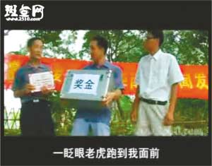 事隔4個(gè)多月后,近日“周老虎”還原真相成了紙老虎。隨后記者在斑點(diǎn)網(wǎng)等視頻網(wǎng)站上看到,從6月30日開(kāi)始,全長(zhǎng)27分47秒的視頻小電影《拍虎》也被傳到網(wǎng)上,片中周正龍被稱為“周震聾”,因?yàn)榱謽I(yè)局張局長(zhǎng)承諾“如果當(dāng)?shù)卮迕裨谖覀兛疾礻?duì)進(jìn)山之前能發(fā)現(xiàn)華南虎,我們會(huì)給一箱錢(qián)作為獎(jiǎng)勵(lì)”,于是“周震聾”十分興奮,上山尋虎十幾天,最后與人密謀通過(guò)年畫(huà)拍出華南虎照片。全片最后表現(xiàn)“周震聾”在事情敗露后,從山崖摔下導(dǎo)致失憶,人也變得瘋瘋癲癲,成天抱著個(gè)假老虎模型唉聲嘆氣。