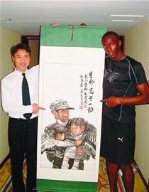牙買(mǎi)加飛人博爾特在奧運(yùn)會(huì)百米決賽中以9秒69震驚世界,昨日記者獲悉,博爾特與山東濟(jì)寧的一位農(nóng)民畫(huà)家還有一段小故事——— 奧運(yùn)開(kāi)幕前夕,博爾特隨牙買(mǎi)加體育代表團(tuán)在天津訓(xùn)練時(shí),濟(jì)寧畫(huà)家房貽德特意托人向博爾特贈(zèng)送了一幅抗震救災(zāi)題材國(guó)畫(huà),博爾特欣然接受,并回贈(zèng)了一件他的簽名運(yùn)動(dòng)服。
