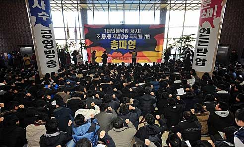 12月26日,MBC電視臺(tái)開始加入總罷工的行列。繼新聞節(jié)目《News Desk》主播樸惠珍罷工之后,主持人文智愛和孫正恩也相繼加入罷工行列。據(jù)悉,此次罷工的起因是韓國(guó)媒體工會(huì)為了反對(duì)韓國(guó)執(zhí)政黨大國(guó)家黨正在推進(jìn)的媒體相關(guān)法案修正案。