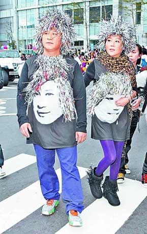 胡瓜、藍(lán)心湄響應(yīng)環(huán)保穿起了由報紙做成的環(huán)保衣服。