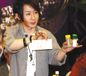 隨后,劉謙開(kāi)始為現(xiàn)場(chǎng)的媒體記者表演了一個(gè)小魔術(shù),只見(jiàn)他拿出了鹽與胡椒粉,將其混在一起,并脫掉了自己手上所有的戒指,把袖子也卷了起來(lái),在瞬時(shí)把鹽和胡椒粉分開(kāi)了。正當(dāng)大家驚呼劉謙水平高時(shí),劉謙突然自己給這個(gè)魔術(shù)解密!斑@個(gè)魔術(shù)其實(shí)已經(jīng)流傳了100多年了,這個(gè)胡椒粉其實(shí)是鐵砂,我手中藏了一塊磁鐵,只要用磁鐵一吸,鐵砂就從鹽中分離出來(lái)了。不過(guò),我在5月8日首演時(shí),將會(huì)把真正的混在一起的鹽與胡椒粉在10秒之內(nèi)分開(kāi),這才是我最新的魔術(shù)!