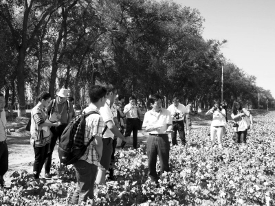 9月4日,參加“文化中國——海外華文媒體新疆行”的媒體代表到石河子采訪。石河子市外僑辦主任高輿陶(中)向媒體團(tuán)成員介紹當(dāng)?shù)胤N植棉花的情況!拔幕袊M馊A文媒體新疆行”采訪活動由中國國務(wù)院僑辦和新疆維吾爾自治區(qū)僑辦主辦,有來自美國、加拿大、法國等23個(gè)國家和地區(qū)的40家華文報(bào)紙、雜志、電視臺參加。(張紅攝)