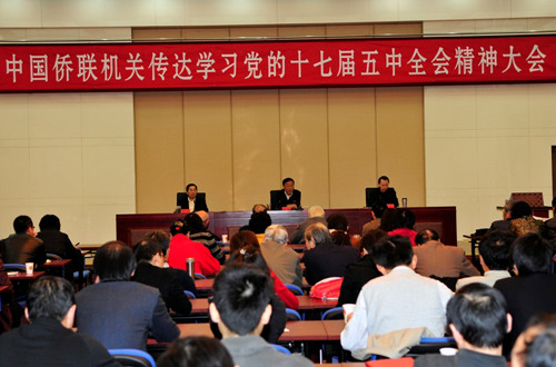 中新網(wǎng)10月20日電 據(jù)中國(guó)僑聯(lián)網(wǎng)消息,10月19日上午,中國(guó)僑聯(lián)機(jī)關(guān)召開(kāi)傳達(dá)學(xué)習(xí)黨的十七屆五中全會(huì)精神大會(huì)。中國(guó)僑聯(lián)在京顧問(wèn)、僑聯(lián)機(jī)關(guān)、直屬企事業(yè)單位、離退休全體黨員參加了會(huì)議。中國(guó)僑聯(lián)主席林軍介紹了參加十七屆五中全會(huì)的情況并傳達(dá)了中共中央總書(shū)記胡錦濤在全會(huì)上的兩次講話和國(guó)務(wù)院總理溫家寶就《中共中央關(guān)于制定國(guó)民經(jīng)濟(jì)和社會(huì)發(fā)展第十二個(gè)五年規(guī)劃的建議》所作的說(shuō)明。中國(guó)僑聯(lián)副主席董中原主持會(huì)議,副主席喬衛(wèi)出席會(huì)議。
