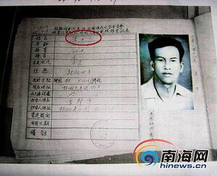 陳良維說(shuō),經(jīng)過(guò)查詢父親檔案,父親原來(lái)在馬來(lái)西亞生活時(shí),名字叫李燕鴻(音),1915年6月出生于馬來(lái)西亞馬六甲,祖籍福建,從祖代起在馬來(lái)西亞馬六甲定居。在他原來(lái)的家族里,父親陳亞九(李燕鴻)共有親兄弟6人,他在家中排行第三,在馬來(lái)西亞的親人上有兩個(gè)大哥、下有3個(gè)弟弟,大哥做工、二哥捕魚、四弟做橡膠買賣,五弟和六弟當(dāng)司機(jī)。家里有樓房和商鋪,還有其它產(chǎn)業(yè),父親陳亞九出生時(shí)祖父就已去世。原來(lái)的家庭住址為馬來(lái)西亞檳城大車路71B。