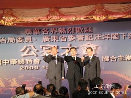 汪洋書記回顧了歷史上各個時期泰國華僑華人對中國革命和建設(shè)的貢獻。他說,廣大旅居泰國的華僑華人,充分發(fā)揚中華民族勤勞勇敢,艱苦奮斗的優(yōu)秀品質(zhì)和聰明才智,白手起家,克勤克儉,歷盡艱辛,經(jīng)過不懈努力,在政治、經(jīng)濟、文化、教育等領(lǐng)域取得了輝煌的成就。廣大僑胞的歷史是一部忠貞不渝的愛國史,廣大僑胞的歷史也是一部與所在國民眾和睦相容的友好史,多年來廣大旅泰僑胞在開拓創(chuàng)業(yè)的同時,不忘回饋社會,積極參與當(dāng)?shù)亟ㄔO(shè),與泰國人民共存共榮,已經(jīng)和諧地融入了當(dāng)?shù)氐纳鐣,為泰國?jīng)濟、文化的發(fā)展和社會進步做出了重要的貢獻,得到了泰國人民的贊許和肯定,并為中泰兩國的友好往來與交流合作奠定了重要的基礎(chǔ),發(fā)揮了橋梁的作用。