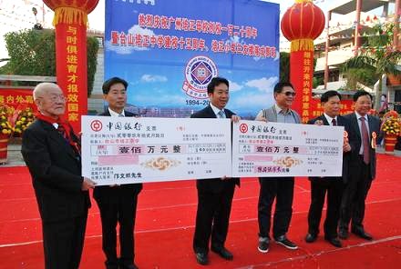 慶典現(xiàn)場上,鄺文熾先生以97歲的高齡,真情訴說著紅藍兒女與培正的綿綿情意,在展望臺山培正學校美好未來時,鄺老當即現(xiàn)場捐出人民幣100萬元,這一義舉引來一片喝彩,也讓在場人士無不為之動容。在他的帶動下,培正校友陳國強先生也現(xiàn)場捐資100萬元,為臺山培正的發(fā)展再添力量。