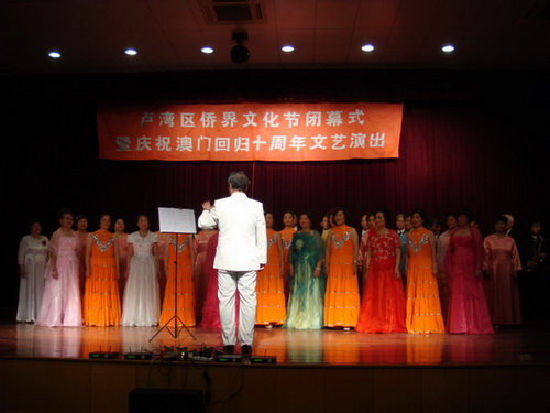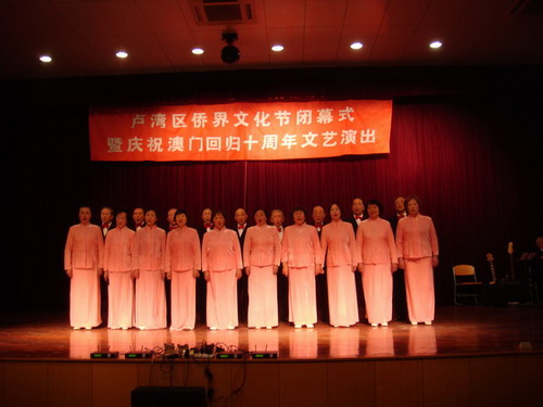 一首優(yōu)美動聽的《七子之歌—澳門》拉開了盧灣區(qū)僑界文化節(jié)閉幕式暨慶祝澳門回歸十周年文藝演出的序幕,來自區(qū)內(nèi)僑界親情中華藝術(shù)團(tuán)、五里社區(qū)、打浦社區(qū)、SUNDAY合唱團(tuán)的各種歌曲、大合唱、時裝表演、器樂演奏、上海說唱等節(jié)目你方唱罷我登場,充分展示了盧灣區(qū)僑界文化節(jié)活動的豐富多彩,充分展示了盧灣區(qū)僑界群眾的良好風(fēng)貌。