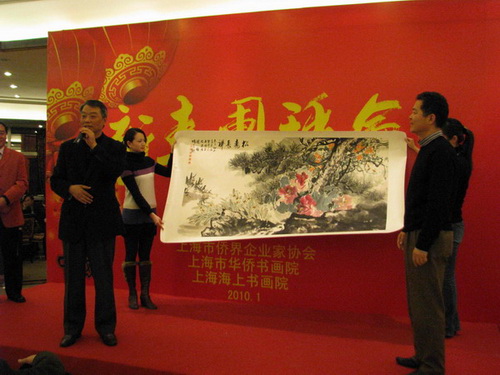 朱鵬高向上海市僑界企業(yè)家協(xié)會(huì)贈(zèng)送書、畫各一幅,并為團(tuán)拜會(huì)活動(dòng)提供獎(jiǎng)品的10位企業(yè)家贈(zèng)送了珍貴禮品。團(tuán)拜會(huì)節(jié)日氣氛濃烈,期間進(jìn)行了精彩的文藝演出及抽獎(jiǎng)活動(dòng)。