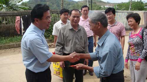 每到一戶(hù),王勝都詢(xún)問(wèn)他們家庭的生產(chǎn)生活情況及身體狀況,并送上慰問(wèn)金和慰問(wèn)品。瓊中和屯昌縣政府官員和當(dāng)?shù)赝馐聝S務(wù)辦負(fù)責(zé)人陪同慰問(wèn)。