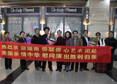 中新網(wǎng)2月11日電 據(jù)湖南省僑聯(lián)消息,經(jīng)湖南省政府批準(zhǔn),由湖南省僑聯(lián)組團(tuán),湖南省僑聯(lián)、長(zhǎng)沙市外事僑務(wù)辦公室、長(zhǎng)沙市僑聯(lián)、開福區(qū)僑聯(lián)主辦,應(yīng)美國(guó)有關(guān)僑(社)團(tuán)的邀請(qǐng),湖南省僑聯(lián)僑心藝術(shù)團(tuán)于2010年1月23至2月8日,在紐約、洛杉磯、華盛頓、休斯敦、圣安東尼奧等城市“親情中華”赴美慰問巡演,圓滿成功,于2月9日載譽(yù)平安歸來。