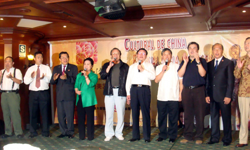 中新網(wǎng)2月22日電 據(jù)《南美僑報(bào)》報(bào)道,為了歡迎到秘魯訪演的“文化中國·四海同春”南美藝術(shù)團(tuán),以中華通惠總局為首的利馬各華人社團(tuán),21日晚在富臨門酒店舉行盛大歡迎晚會(huì),國務(wù)院僑辦副主任馬儒沛、中國駐秘魯大使趙五一和通惠總局三位主席蕭孝權(quán)、周銳波、楊學(xué)勤等近五百人出席了晚會(huì)。