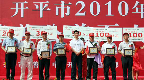 3月3日,開平市在城市廣場舉行2010年慈善公益萬人行活動起步儀式,同時表彰了一批慈善活動作出突出貢獻(xiàn)的海外僑胞、港澳同胞和海外社團(tuán)。據(jù)悉,今年以來,該市慈善會共收到來自海外鄉(xiāng)親、社團(tuán)的捐款1366萬多元,其中海外鄉(xiāng)親捐款達(dá)1297萬元,涌現(xiàn)旅港鄉(xiāng)親譚逢敬先生捐款800萬元,譚華正先捐款200萬元等一批突出貢獻(xiàn)的熱心人士。開平市委書記馮立堅(jiān)在慈善公益萬人行活動上,接受了海外僑胞和港澳鄉(xiāng)親熱心人士支票捐贈儀式,并代表開平市慈善會向譚氏宗親會、香港開平同鄉(xiāng)會、澳門開平同鄉(xiāng)會。旅港鄉(xiāng)親譚逢敬、譚華正、梁家熹、譚福添、吳漢良、譚錦濠、譚景彬、譚凱銘等善長仁翁頒發(fā)慈善紀(jì)念牌匾予以表彰。