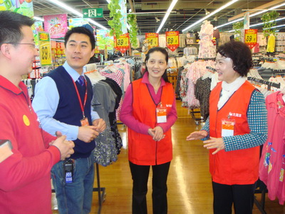 在超市負(fù)責(zé)人的帶領(lǐng)下,全體黨員分別在服飾區(qū)、生鮮區(qū)、果蔬區(qū)、停車場(chǎng)進(jìn)行了3個(gè)小時(shí)的服務(wù)體驗(yàn)活動(dòng)。