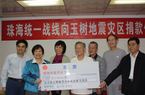 中新網(wǎng)4月22日電 據(jù)珠海外僑局消息,4月20日下午,廣東省珠海市委統(tǒng)戰(zhàn)部在三樓大廳舉行為青海玉樹地震災(zāi)區(qū)捐款儀式,珠海市新馬泰的僑友在副會長車玉屏、張舉安的帶領(lǐng)下共捐款2800元,為青海玉樹地震災(zāi)區(qū)獻上珠海特區(qū)僑友的一片愛心。
