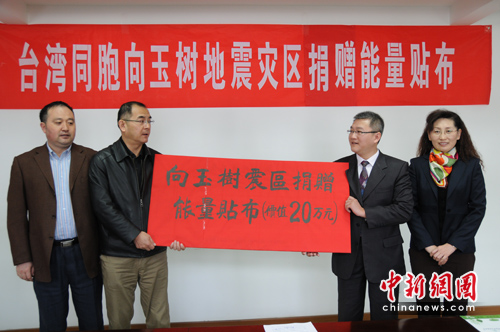 中新網(wǎng)北京4月28日電(記者 張冬冬)臺(tái)灣通德興業(yè)股份公司董事長(zhǎng)陳前芳28日在此間向中國(guó)華僑經(jīng)濟(jì)文化基金會(huì)捐贈(zèng)價(jià)值20萬(wàn)元人民幣的能量貼布,用以支援青海玉樹(shù)抗震救災(zāi)。