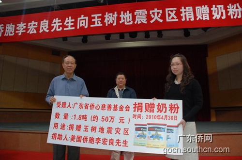 中新網(wǎng)5月4日電 據(jù)廣東僑網(wǎng)消息,玉樹災(zāi)情牽動(dòng)廣大海外僑胞、港澳同胞的心。在獲悉青海玉樹地區(qū)發(fā)生7.1級(jí)強(qiáng)烈地震的消息后,美國僑胞、南加州潮州會(huì)館會(huì)長李宏良先生立即決定通過廣東省僑心慈善基金會(huì)向玉樹災(zāi)區(qū)捐贈(zèng)1.8噸奶粉,價(jià)值約50萬元人民幣,以幫助玉樹災(zāi)區(qū)的孩子渡過難關(guān)。