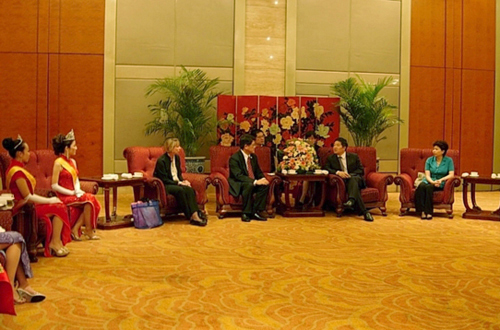 中新網(wǎng)6月23日電 據(jù)國僑辦網(wǎng)站消息,6月17日晚,國務(wù)院僑辦副主任任啟亮在北京新世紀(jì)飯店會見并宴請了由夏威夷中華總商會主席劉廣義率領(lǐng)的“第六十一屆水仙花皇后友好訪問團”全體成員。