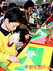 一名兒童在"喜迎澳門回歸,共創(chuàng)美好明天"園游會上認(rèn)真地拼裝澳門特區(qū)區(qū)旗圖案。澳門為紀(jì)念澳門基本法頒布六周年,于二十八日開始舉行系列活動,以增強(qiáng)人們的回歸意識。