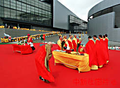 澳門文化中心揭幕典禮上正在舉行宗教祈福儀式。該文化中心座落在澳門新口岸填海區(qū)海邊,其建筑造型設(shè)計新縪,將成為澳門城市的一個標(biāo)志。