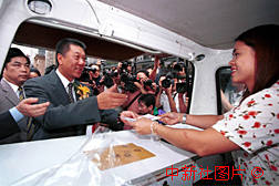 澳門特別行政區(qū)首任行政長官何厚鏵三十一日在街頭郵政車前,為澳門回歸倒計時五十天紀念郵封加蓋郵戳。