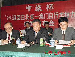 被列入慶祝澳門回歸祖國正式慶典活動(dòng)之一的"中旅杯九九迎回歸北京至澳門自行車?yán)?十四日在北京舉行新聞發(fā)布會(huì):屆時(shí)將有來自全國各省市及香港、澳門的十二支代表隊(duì)共七十二名運(yùn)動(dòng)員參加這一中國有史以來規(guī)模最大、水平最高、距離最長的比賽。